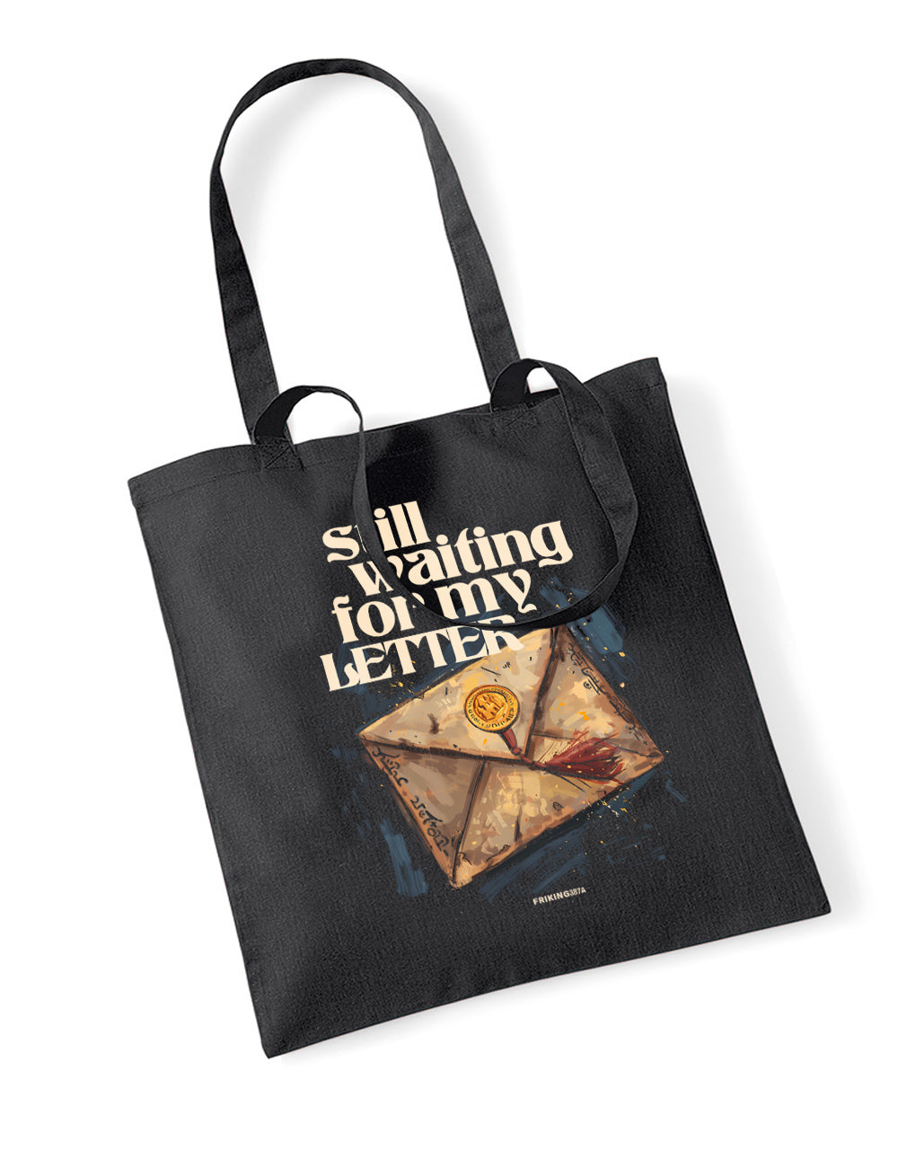Bolsa de tela con asas original Still waiting. No hay mejor manera de llevar todas tus cosas que en nuestras bolsas frikis hechas 100% de tejido de algodón. Cuentan un asa larga del mismo color que la bolsa, para que puedas llevarla cómodamente a todas partes.