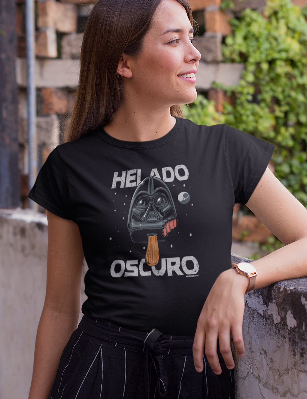 Camiseta de manga corta de mujer Helado Oscuro hecha para ti, de corte entallado y con cuello redondo doble acanalado. Camiseta 100% algodón diseñada con costuras laterales y reforzada en cuello y hombros para que te sientas tan agusto que no quieras quitártela.